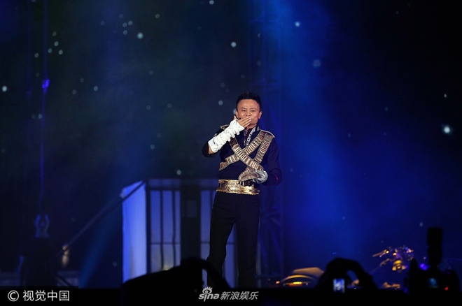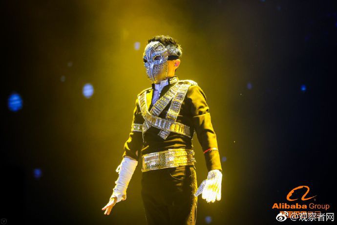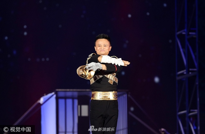 Jack Ma ในชุดแบบ Michael Jackson แต่สวมหน้ากาก นั่งบนมอเตอร์ไซค์ คันใหญ่ ก่อนลงมายืน กลางเวที โชว์สเต็ป เท้าไฟ ในเพลงยอดฮิต อย่าง Billie Jean ด้วยท่าลูบเป้า ที่ทุกคนรู้จัก